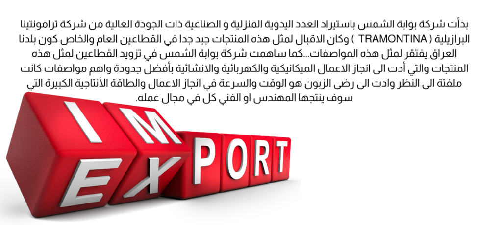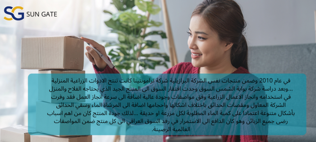 حاجة السوق وثقة الزبائن في القطاعين العام والخاص بكل المنتجات التي اعتمدتها شركة بوابة الشمس تم اختيار منتج اخر وايضا ضمن منتجات نفس الشركة العالمية ترامونتينا برازيلية المنشأ تم اختيار منتج بمجال اخر والذي كان السوق بحاجة ماسة لها وبجودة عالية والسعر المناسب كان سنك المطبخ هو ضمن المواد التي تم تزويد السوق لهذا المنتج كونه يعطي جمال وجودة وضمان مفتوح مدى الحياة اضافة الى دخول هذا المنتج ضمن الجودة الصحية التي تدخل في الصحة العامة للمواطن والتحذير من المشاكل والامراض التي تسببها المنتج الرديء …لذلك حصل هذا المنتج الى رضى الزبائن وتحقيق نقلة نوعية في اختيار القطاعات جميعها لهذا المنتج ومن المنشأ البرازيلي ذات الجودة العالية والمواصفات العالمية الرصينة.